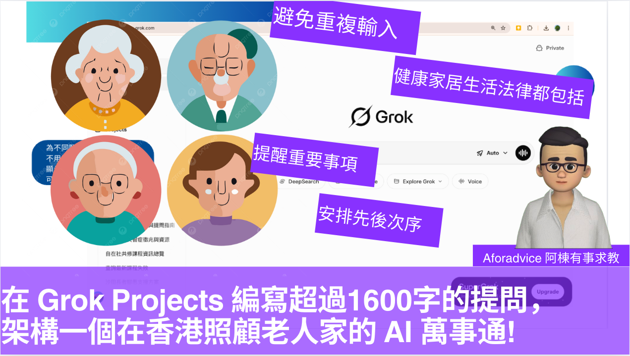 在 Grok Projects 編寫超過1600字的提問, 架構一個在香港照顧老人家的 AI 萬事通!